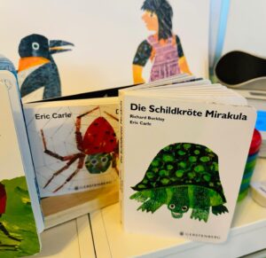 Gebasteltes Bild einer kleinen Raupe Nimmersatt aus bemalten Papierkreisen auf blauem Papier, gestaltet von einem Kind der Großtagespflege Rappelkiste Hochdahl. Holzspielzeug mit einem roten Deckel als Kopf der kleinen Raupe Nimmersatt und lila Filzohren neben einem bunten Holzsteckspiel. Selbstgebasteltes Bild einer kleinen Raupe Nimmersatt aus buntem Papier, aufgehängt an einer roten Schnur mit Wäscheklammern. Kind beobachtet einen Pinguin hinter Glas im Zoo während eines Ausflugs der Großtagespflege Rappelkiste Hochdahl. Bunte Kinderbastelbilder mit echten Herbstblättern und Zeichnungen auf farbigem Papier aus der Großtagespflege Rappelkiste Hochdahl. Rappel-Kiste goes Jungle Zaubersand Astrid Berger (links) und Yvonne Kaatz (rechts), die Tagesmütter der Großtagespflege Rappel-Kiste Hochdahl, stehen nebeneinander und lächeln in die Kamera. Behutsamkeit Basteln Rappel-Kiste goes Jungle Neandertal Turnen im Roncalli Kindergarten Rappel-Kiste goes Jungle Zahnputzwoche Muttertagsgeschenk Plätzchen backen Spielhaus und Spielzeug